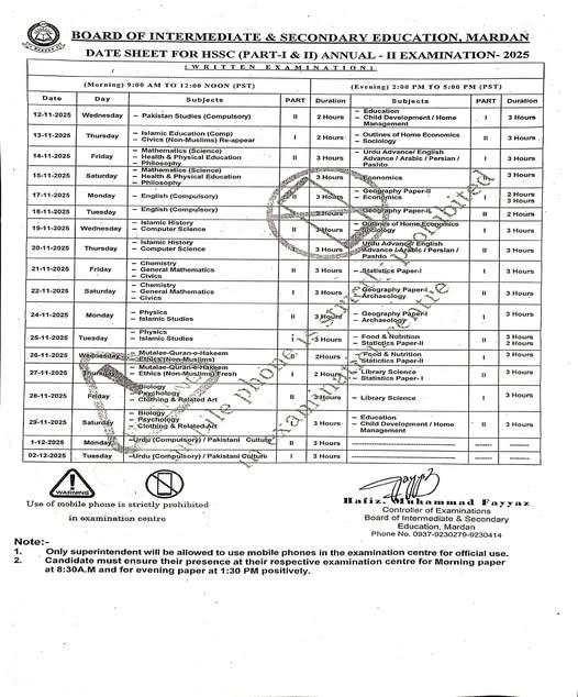 Mardan, Board of Intermediate and Secondary Education Mardan has already received the admission forms and fee from the failed students of the intermediate class first annual exams 2025. Now the mardan board has set up the exams halls and issued the roll number slips and BISE Mardan Inter 2nd Annual Exams 2025 Date Sheet so that the students can become able to appear in the next coming higher secondary school certificate part 1 and 2 second annual exams 2025.