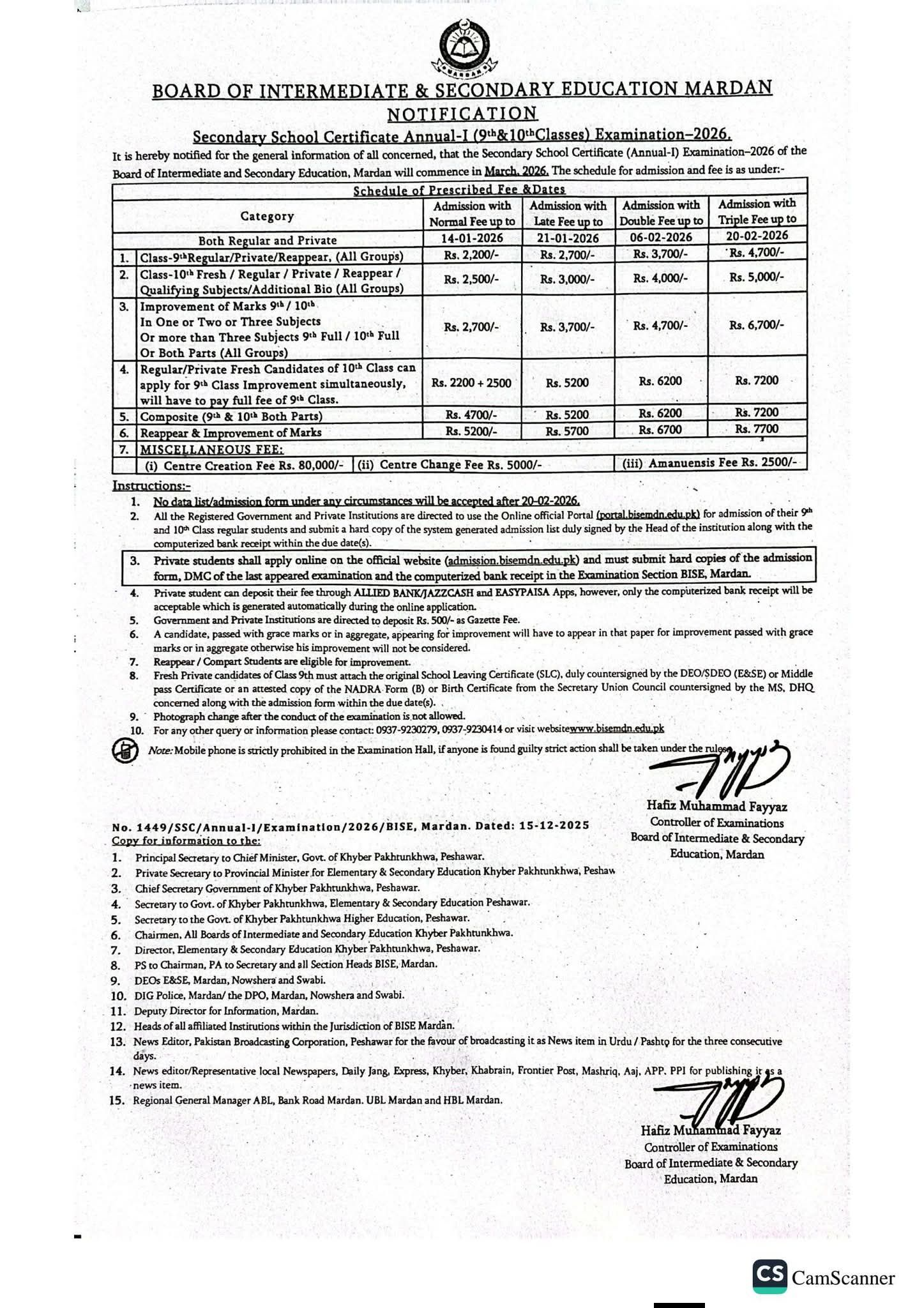 Mardan, Board of Intermediate and Secondary Education Mardan is making all necessary arrangements to manage the secondary school certificate first annual exams for the year 2026. The Mardan Board is going to receive the admission forms and fee from the regular and private students according to their own fee structure. Mardan Board has issued their BISE Mardan Matric 1st Annual Exams 2026 Forms Schedule and the students are advised to follow this timeline to forward their application forms and pay the fee.