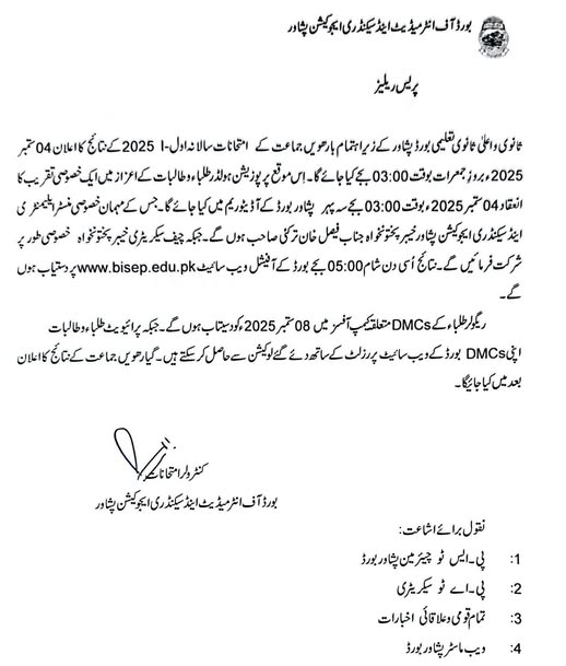 The Board of Intermediate and Secondary Education BISE Peshawar has officially announced the date for the HSSC Part-II 12th Class Annual Examination Result 2025. According to the press release, the BISE Peshawar 12th Class Result 2025 will be declared on Thursday, 4th September 2025 at 3:00 PM.