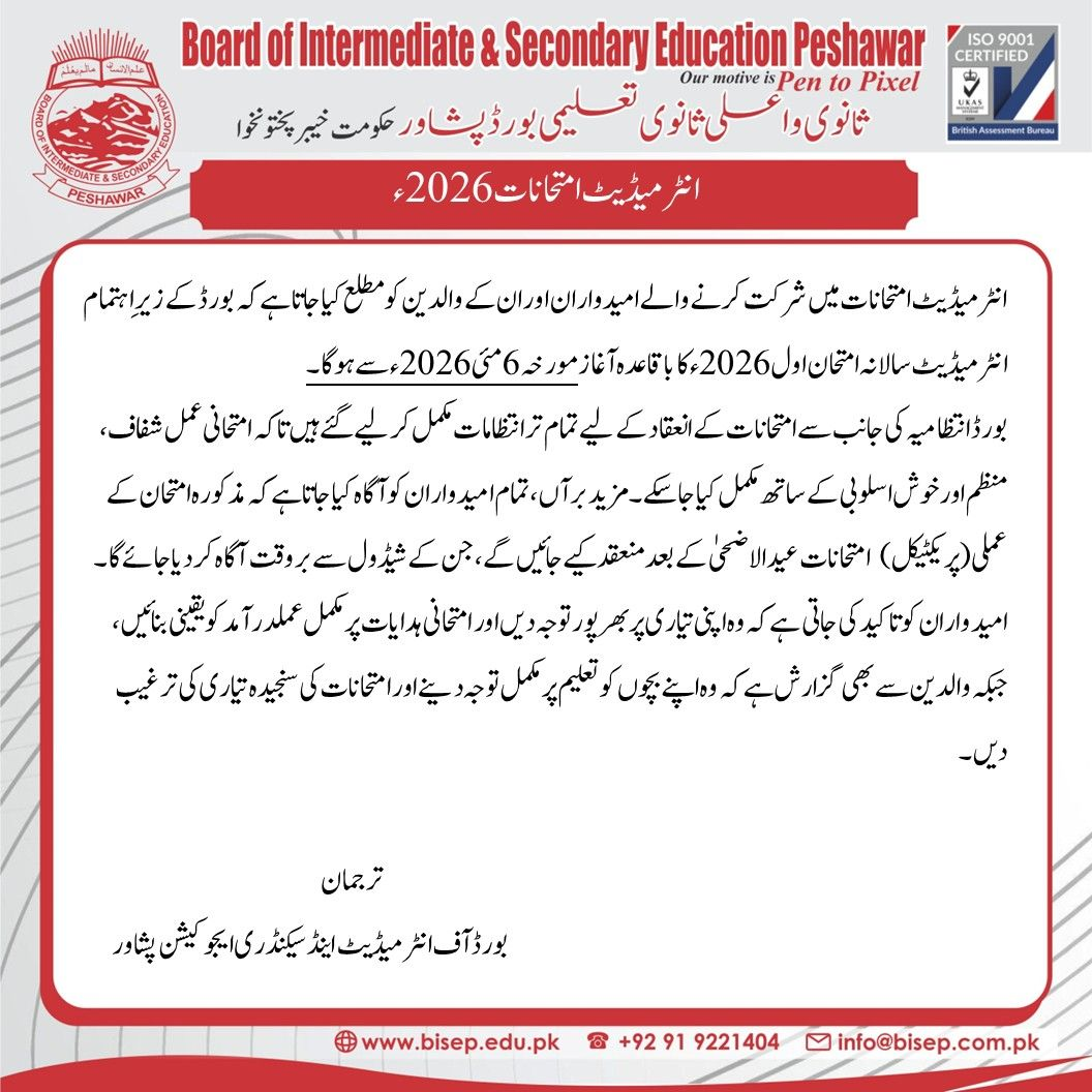 BISE Peshawar Inter Annual Exam Date 2026 Announced