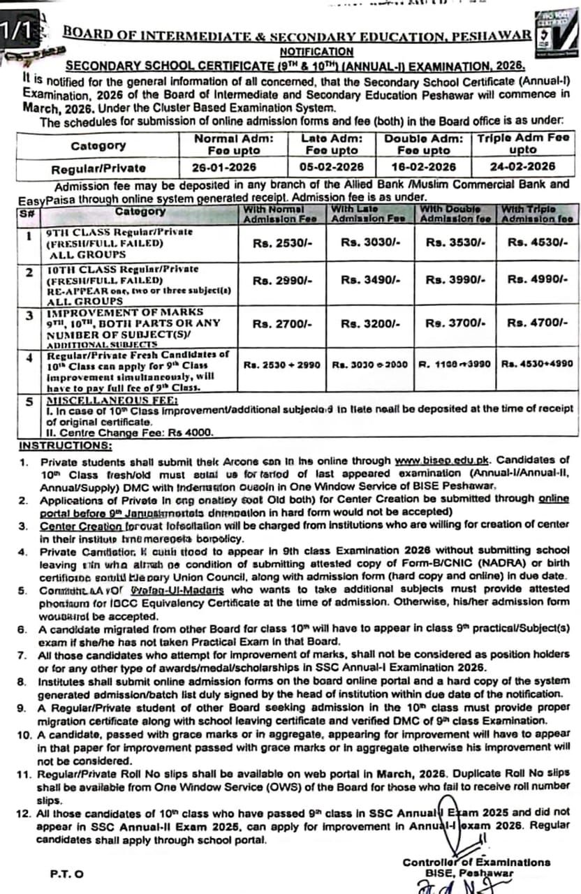 Peshawar, Board of Intermediate and Secondary Education Peshawar is making arrangements for the secondary school certificate first annual exams for the year 2026 on the scheduled dates and time. The exams section of Peshawar Board started collection of the admission forms and fee from the interested candidates so that they can be allowed to attend the exams. The students can view their BISE Peshawar Matric 1st Annual Exams 2026 Forms Schedule.