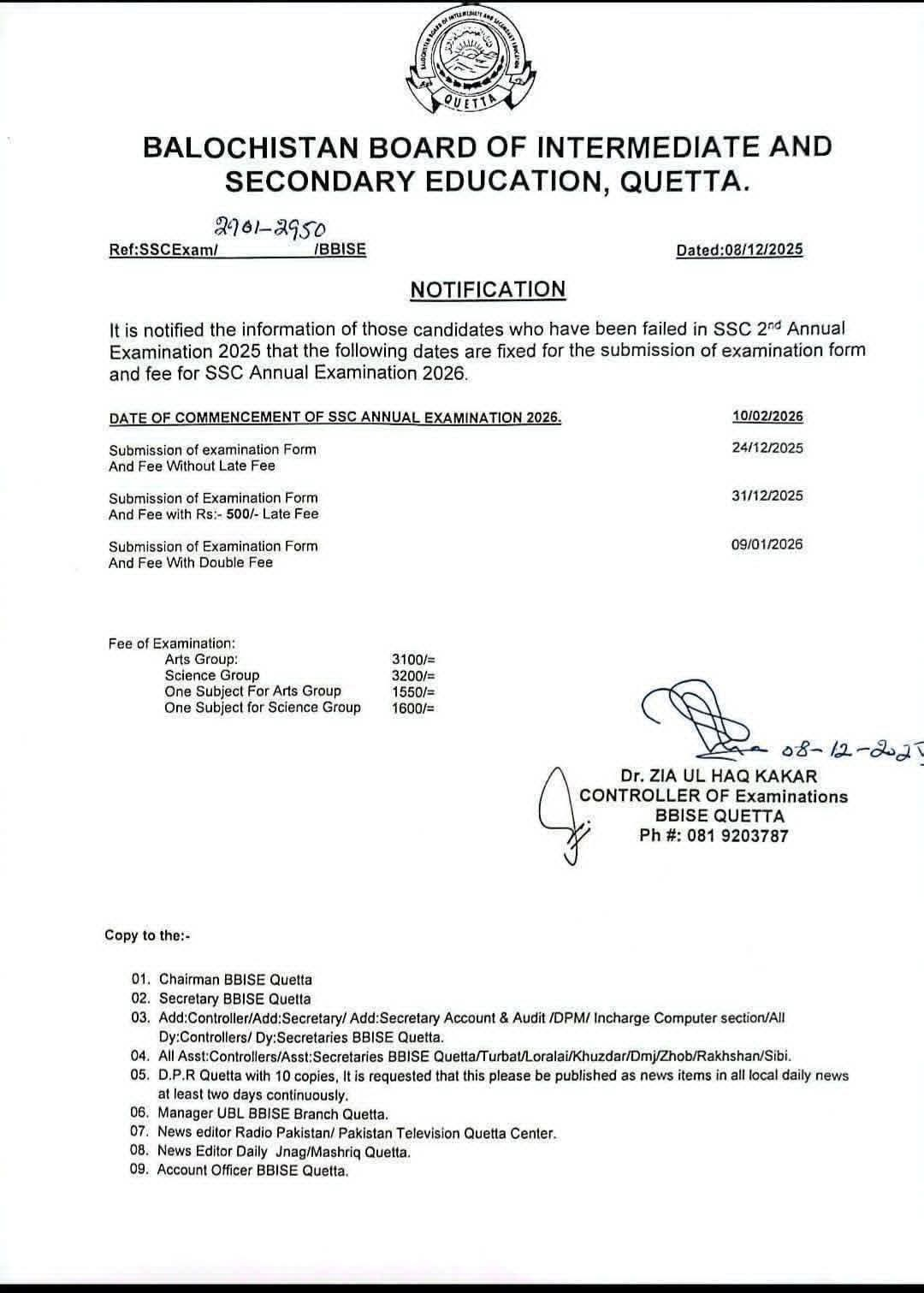 Quetta, Board of Intermediate and Secondary Education Quetta has announced the schedule for the submission of the admission forms to the Quetta Board for the students, who were failed in the matric class second annual exams for the year 2025. The students will follow this complete and comprehensive BISE Quetta SSC 1st Annual Exams 2026 Forms Schedule for Failed Students to forward their application forms with the rate of fee accordingly.
