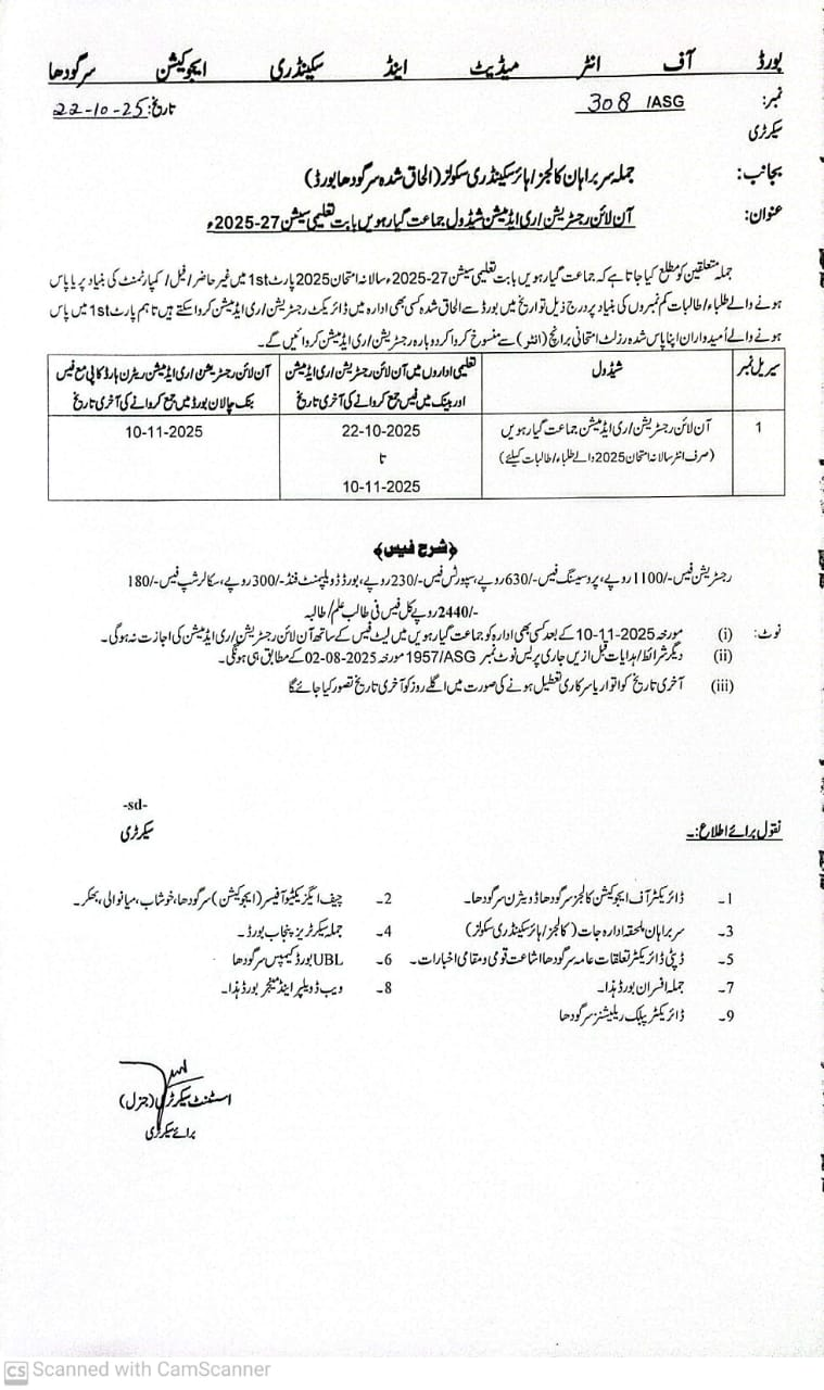 According to the official notification, all affiliated colleges and higher secondary schools under the Sargodha Board can now register and admit students who meet one of the following categories: