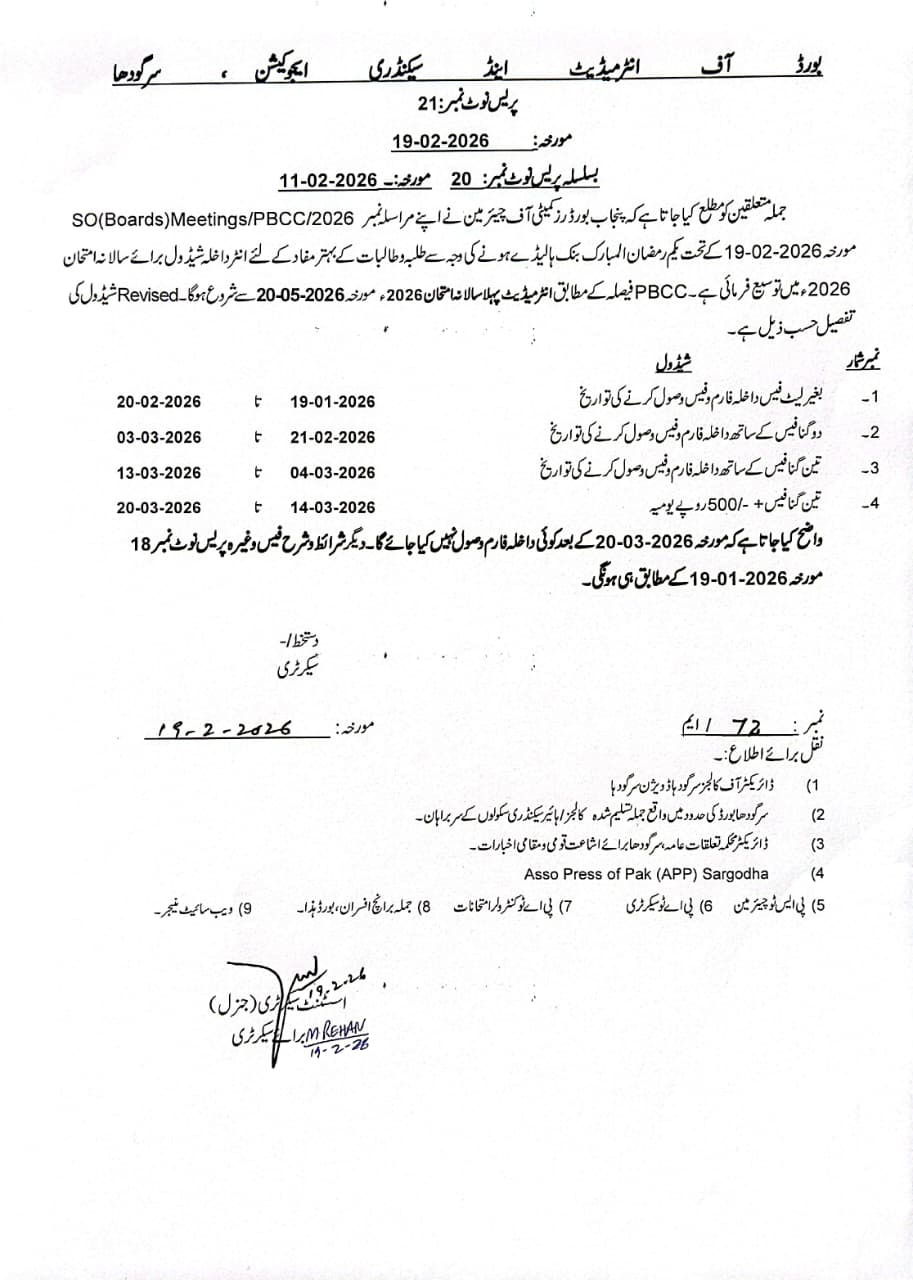 The students will note that there was holiday on 19-02-2026 as there was first of Ramadan on this date. The students had to face the problems while depositing their admission fee. Now the extension of one day has been granted by the education board and the students will submit their admission forms according to the following schedule: