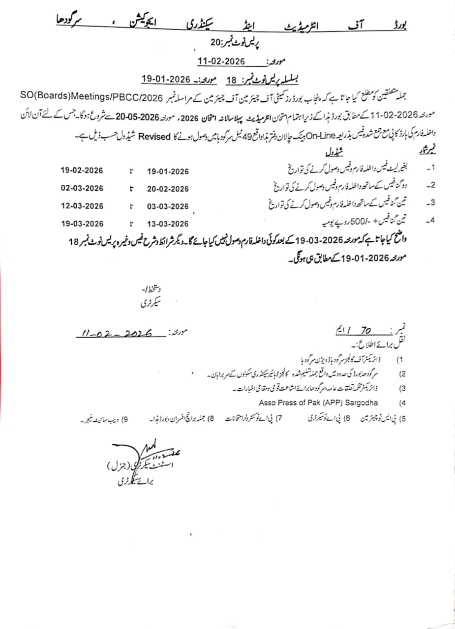 BISE Sargodha Issues Revised Inter 1st Annual Exams 2026