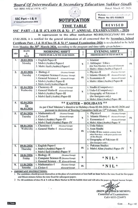 The Board of Intermediate and Secondary Education BISE Sukkur has officially announced the revised date sheet for the BISE Sukkur SSC Part I 9th Class & SSC Part II 10th Class 1st Annual Examinations Date Sheet 2026. According to the boards notification, the annual exams are scheduled to commence on Tuesday, March 31, 2026.