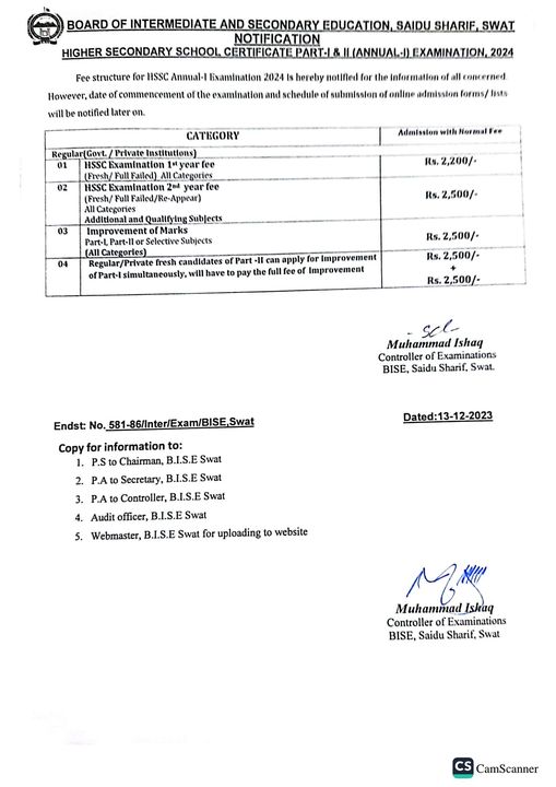 Swat Board HSSC 1st Annual Exams New Fee Rates 2024