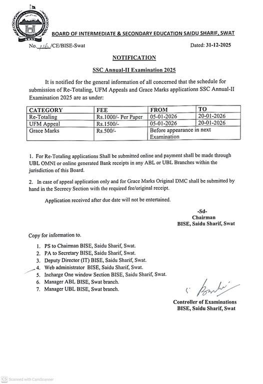 Board of Intermediate and Secondary Education Swat has already announced their matric class second annual exams result for the year 2025. The students, who have objections over their obtained marks and they want to get checked their obtained marks and re-totaling of the marks, or they want to submit the UFM appeal or apply for the grace marks, they can avail the chance by sending their application forms and pay the fee according to BISE Swat Matric 2nd Annual Exams 2025 Re-Totaling, UFM Appeals & Grace Marks Schedule.