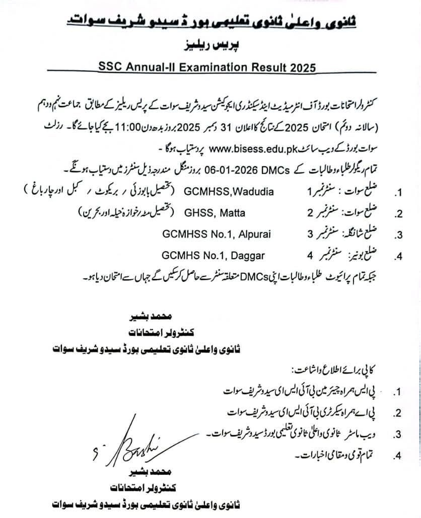 BISE Swat Matric 2nd Annual Exams 2025 Result Announced