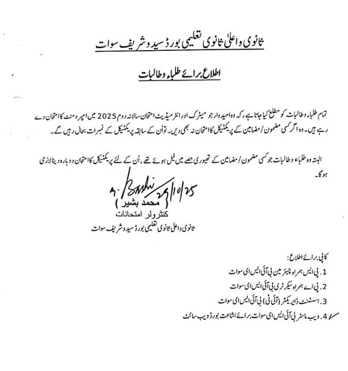 BISE Swat SSC & HSSC 2nd Annual Exams 2025 Practical Schedule