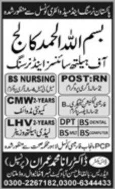 Bismillah Al-Hamd College of Health Sciences & Nursing, approved by the Pakistan Nursing & Midwifery Council PN&MC and recognized by the Ministry of Health, is now accepting applications for various nursing and health science programs.