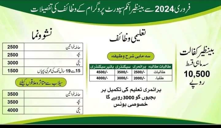 Under the scheme for the BISP for Flood Affected Areas, the pregnant women will receive the income of Rs.3500/-, every boy will get Rs.3500/- and every girl will receive the amount of Rs.4000/-.