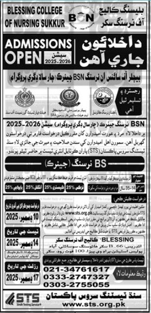 Blessing College of Nursing Sukkur, affiliated with the Pakistan Nursing Council and recognized by the Government of Sindh, is pleased to announce that admissions are open for the Bachelor of Science in Nursing BSN Generic – Four-Year Degree Program for the academic session 2025–2026.