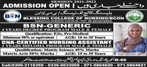 Blessing College of Nursing BSON Sukkur, Registered with Pakistan Nursing Council / PNC is intended to open Admissions and looking for Applications from Interested Students for Admissions in BSN-Generic 4 years Degree Program and CNA-Certified Nursing Assistant 2 years diploma program. Candidates having qualification of FSc Pre-Medical with minimum 50% or equivalent are eligible to apply for BSN Generic and Candidates passed Matric with Arts with minimum 50% marks are eligible to apply for Nursing Assistant. Male and Female both can apply. Admissions are open for Session 2021-22.