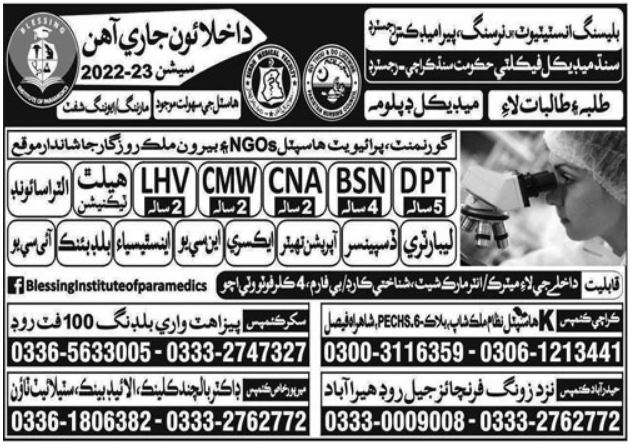 Blessing Institute of Nursing and Paramedics is a leading institute that offers a wide range of admission classes for the academic year 2022-23. Students who are passionate about pursuing a career in the healthcare sector can choose from DPT, BS Nursing, CNA, LHV, CMW, Laboratory Diploma, Dispenser Diploma, OT, and Anesthesia Diploma.