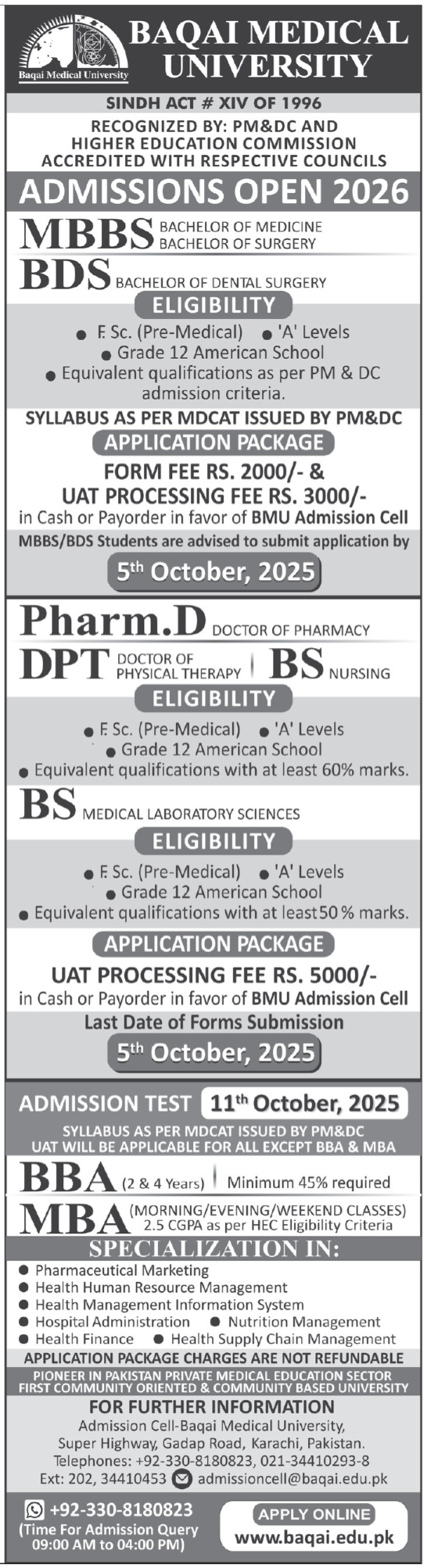 Baqai Medical University BMU – a pioneer in private medical education in Pakistan – proudly announces that admissions for the 2026 academic session are now open across a range of programs in medicine, allied health sciences, and management.
