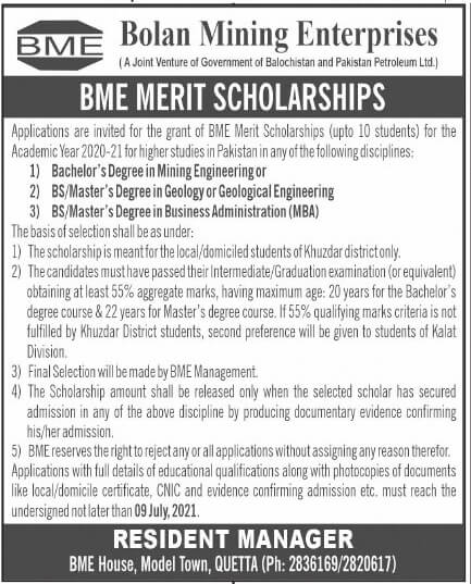 The Government of Balochistan and Pakistan Petroleum Ltd is offering scholarships to the students of Khuzdar in BS and Master Programs studying in Bachelor or Master in disciplines like Bachelor Degree in Mining Engineering, BS/Master Degree in Geology or Geology Engineering and BS/MBA in Business Administration . The eligible and deserving candidates can apply for Bolan Mining Enterprise Scholarships Program 2021. The main purpose to award scholarships is to provide financial aid to the deserving students who are unable to bear their educational expenses. The candidates can apply for the BME Merit Scholarships 2021 through their institutes according to given instructions.