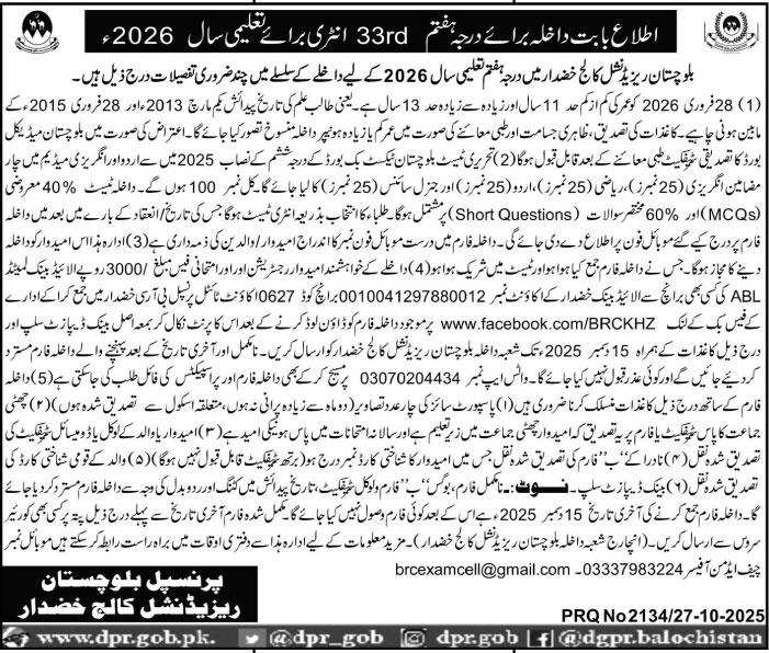 Balochistan Residential College, an English-medium residential institution, invites applications for admission to Class 7th for the academic session 2026 33rd Entry. The following details are important for applicants: