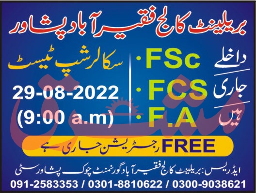 Brilliant College Faqir Abad Peshawar Admission 2022 Invites applicants to apply for admission in their respective institute. Brilliant College Faqir Abad Peshawar is offering courses in FSC Pre Engineering, Pre Medical and FA. Scholarship test shall be held on 29-08-2022 at 9:00 am. Make sure to participate in test. Free Registration in Brilliant College, Faqir Abad. For more assistance, visit their respective branch