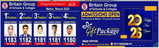 Britain Group of Schools & Colleges is now accepting admissions for the 2026 session. The school offers quality education from Play Group to Matriculation, O-Level, and A-Level programs, providing students with a strong academic foundation and holistic development.