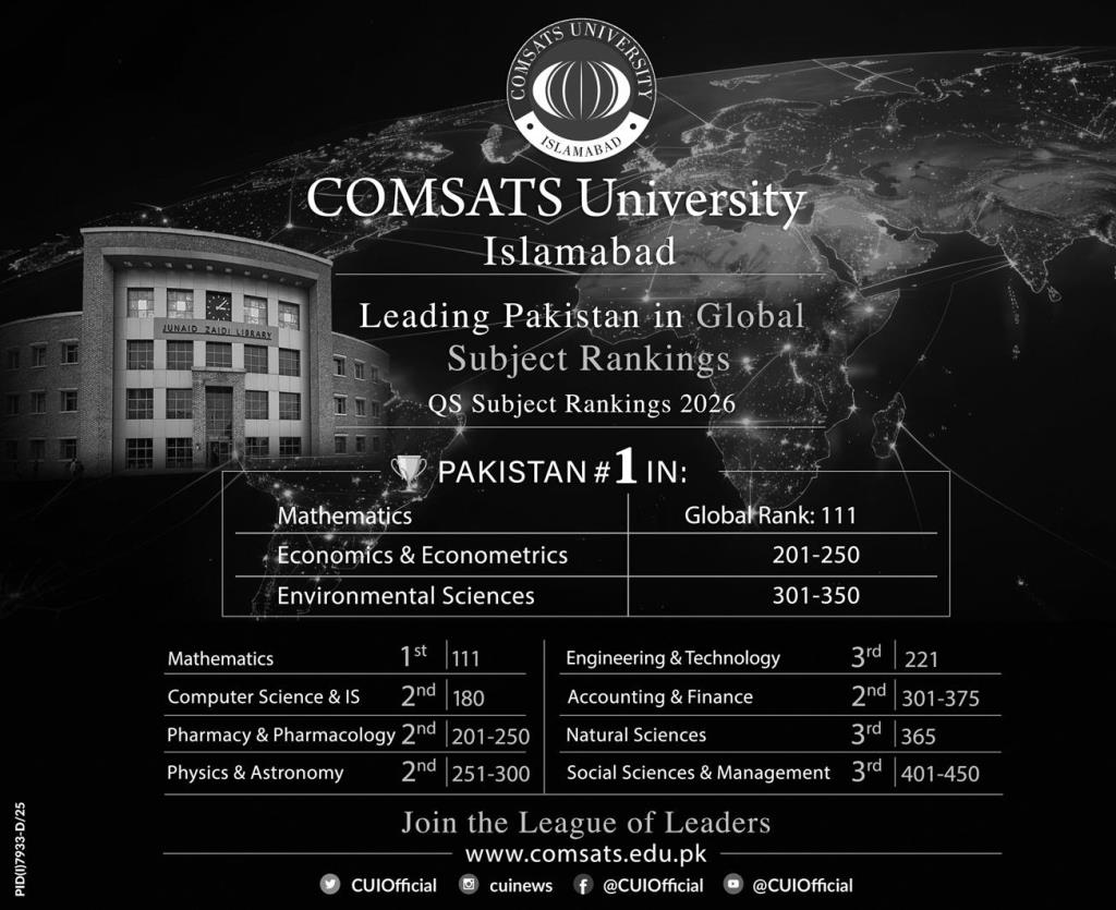 COMSATS University Islamabad has achieved remarkable positions in international rankings, making it a top choice for students seeking quality education. According to the QS Subject Rankings 2026, the university proudly stands among the best in Pakistan and globally: