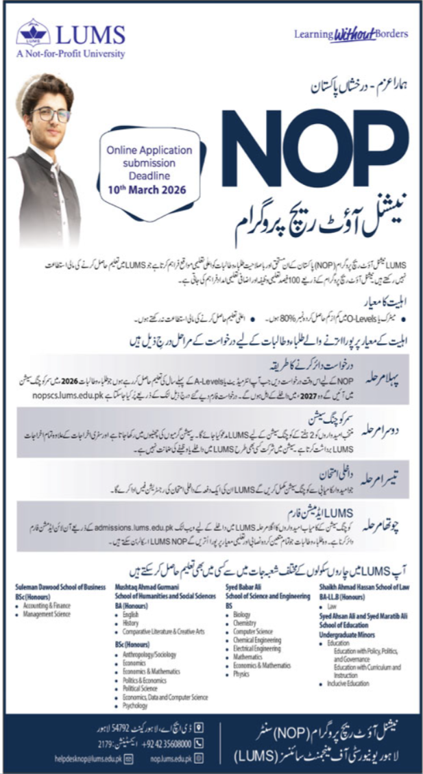 The Lahore University of Management Sciences has officially opened the call for its prestigious National Outreach Programme NOP for the 2026 cycle. As a premier "Not-for-Profit" institution, LUMS continues its mission of "Learning Without Borders" by offering life-changing educational opportunities to brilliant students across Pakistan who face financial constraints.