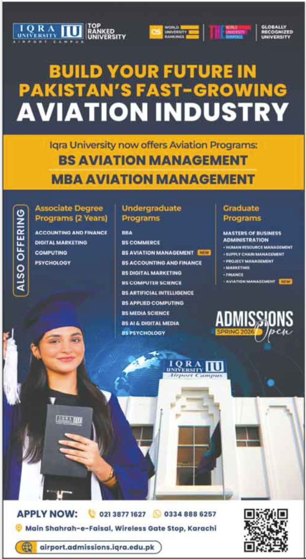 KARACHI — Iqra University, a top-ranked and globally recognized institution, has officially announced the opening of its IU Admissions 2026 for the Spring semester. The Iqra University Airport Campus is inviting applications for a diverse range of programs, specifically highlighting its new ventures into the aviation sector to meet the needs of Pakistans fast-growing aviation industry.