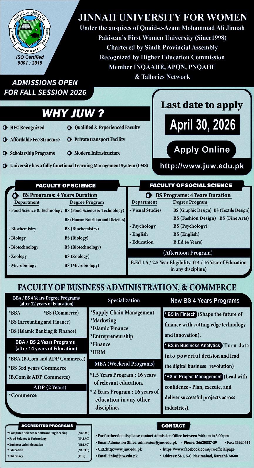Jinnah University for Women has officially announced admissions for the Fall Session 2026. Established in 1998 and operating under the vision of Muhammad Ali Jinnah, the university is recognized by the Higher Education Commission HEC and is known as Pakistan’s first women’s university.