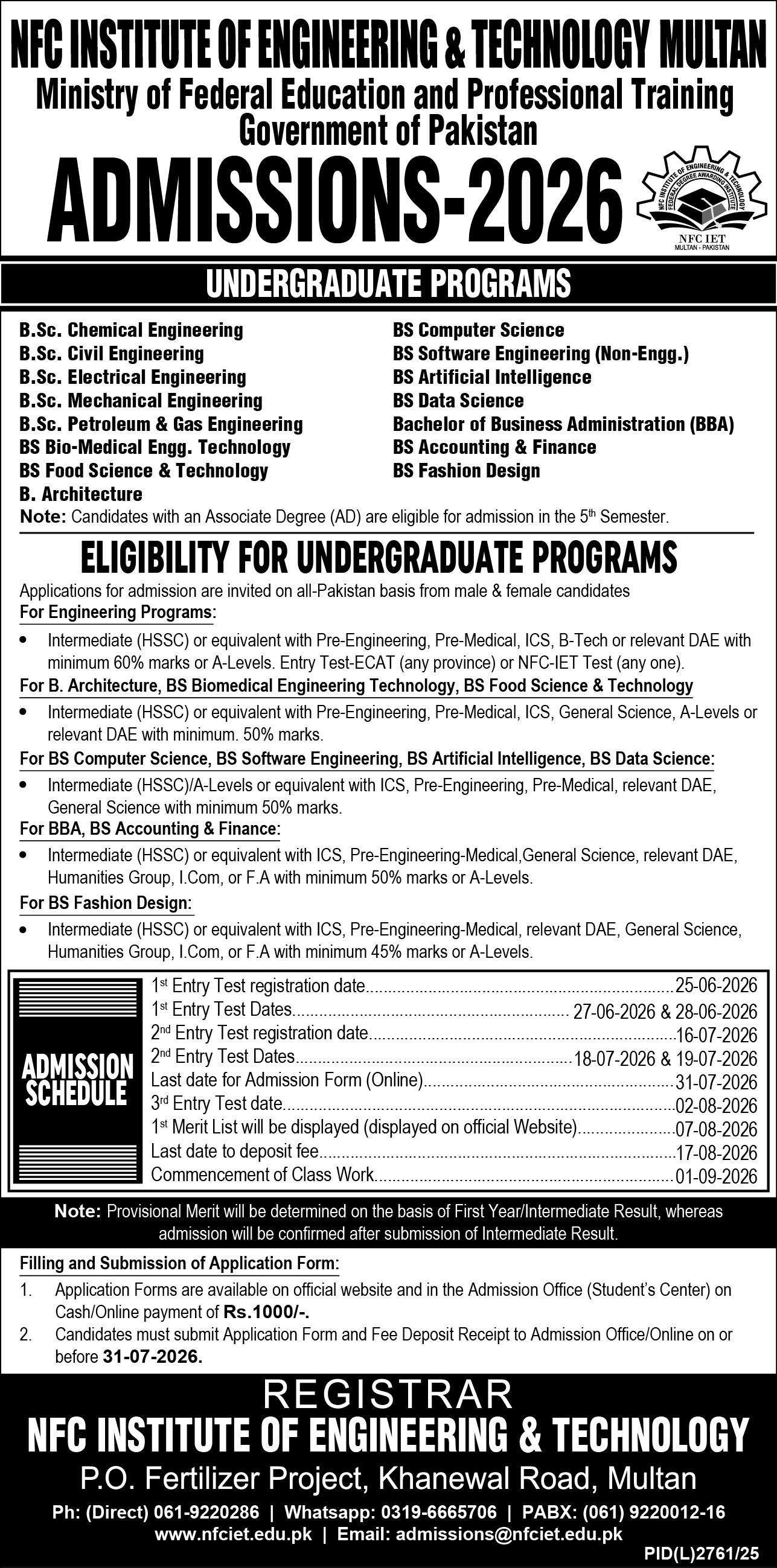 NFC Institute of Engineering and Technology, operating under the Ministry of Federal Education and Professional Training, Government of Pakistan, has announced admissions for Undergraduate Programs for the academic session 2026. The institute is recognized for its excellence in engineering, technology, and management education, offering a wide range of degree programs designed to meet modern industry demands.