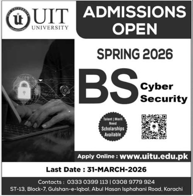 Students interested in building a successful career in Cyber Security and Information Technology are encouraged to take advantage of this opportunity and apply for Spring 2026 admissions at Usman Institute of Technology UIT University before the deadline. This program offers the knowledge, practical experience, and professional skills required to thrive in the rapidly growing cybersecurity field.