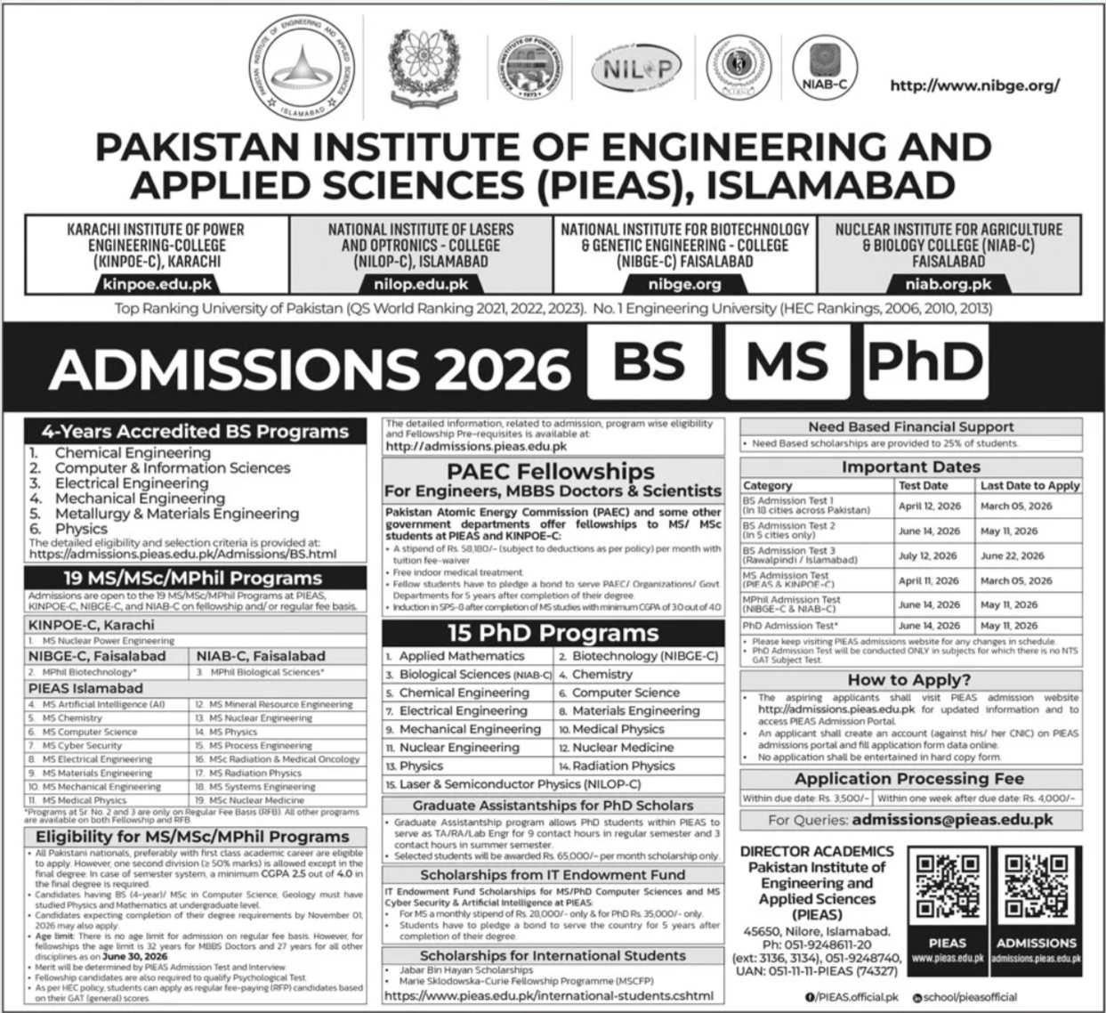 Prospective students can now PIEAS apply online for various 4-year accredited BS programs, as well as extensive MS and PhD offerings. The PIEAS Admissions 2026 process is designed to attract the brightest minds to its Islamabad campus and constituent colleges, including KINPOE-C, NILOP-C, NIBGE-C, and NIAB-C.
