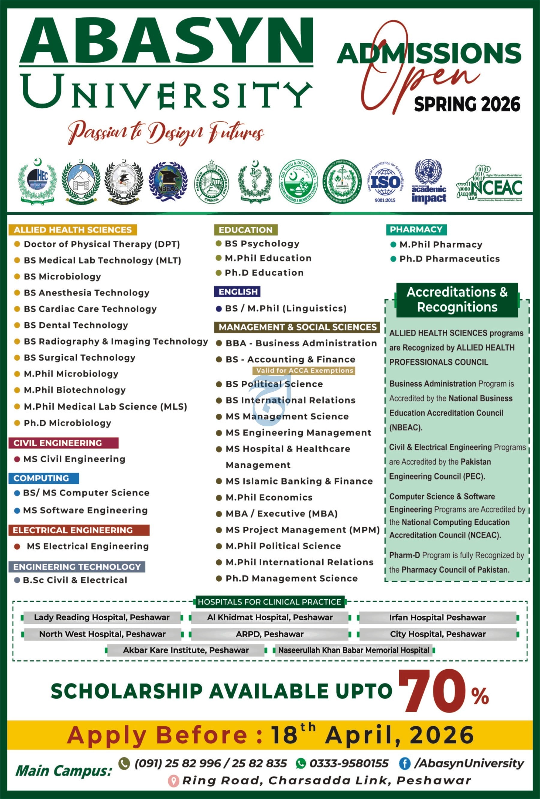 The landscape of higher education in Pakistan continues to evolve, and Abasyn University remains a leading institution in shaping the next generation of professionals. With its motto, "Passion to Design Futures," the university has officially announced that AU Admissions 2026 are now open for the Spring semester. This intake offers a diverse range of undergraduate and postgraduate programs designed to meet the rigorous demands of the global job market.