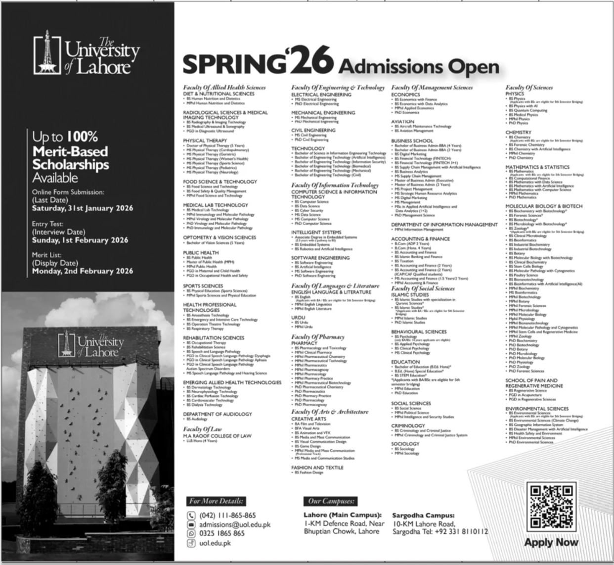 BS, MS, MPhil and PhD Admissions UOL 2026