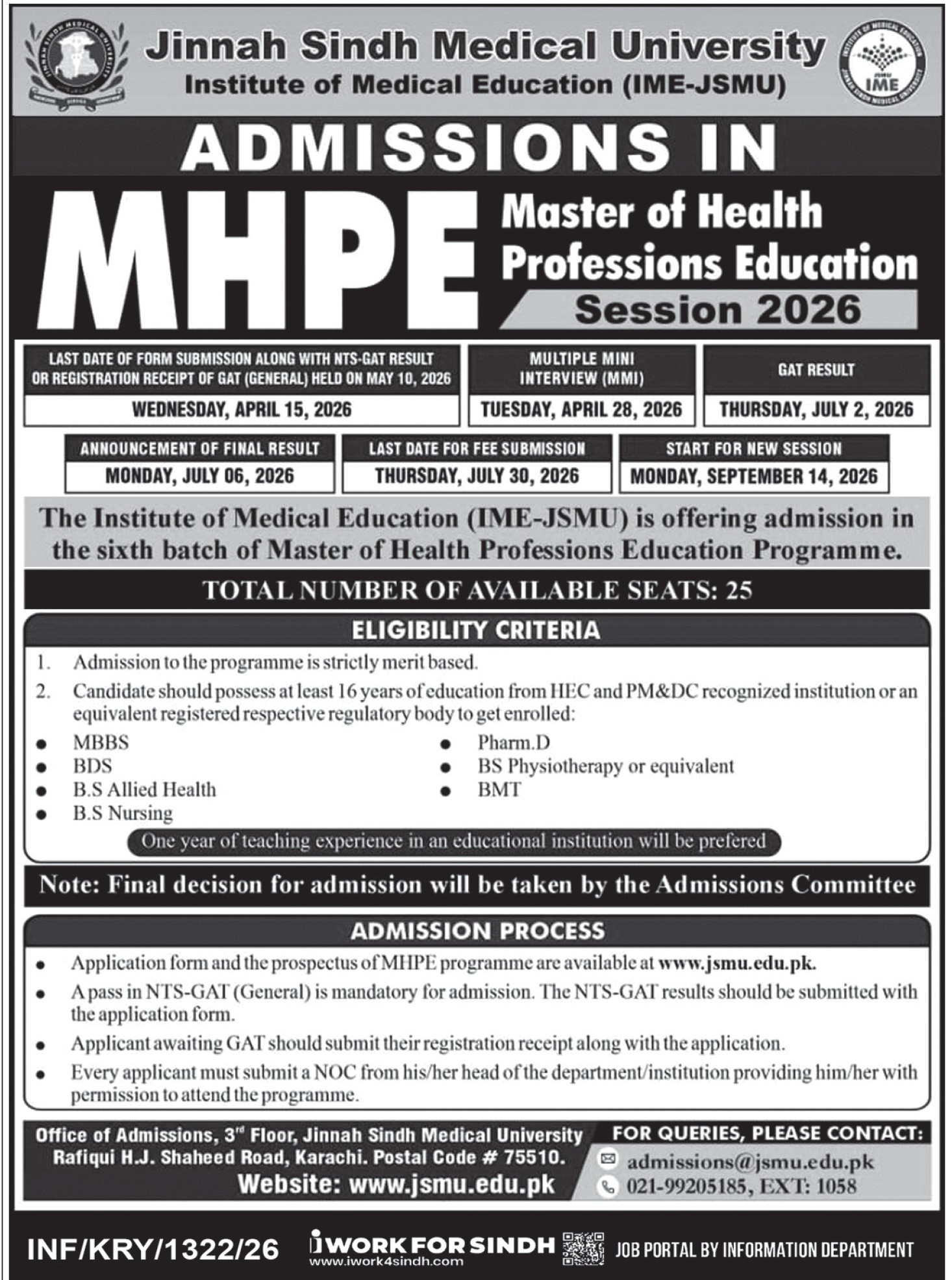 The Jinnah Sindh Medical University JSMU, through its Institute of Medical Education IME, is now accepting applications for the 6th batch of the Master of Health Professions Education MHPE program for the academic session 2026. This prestigious postgraduate program is designed to develop excellence in medical education and professional training.Program Overview by JSMU