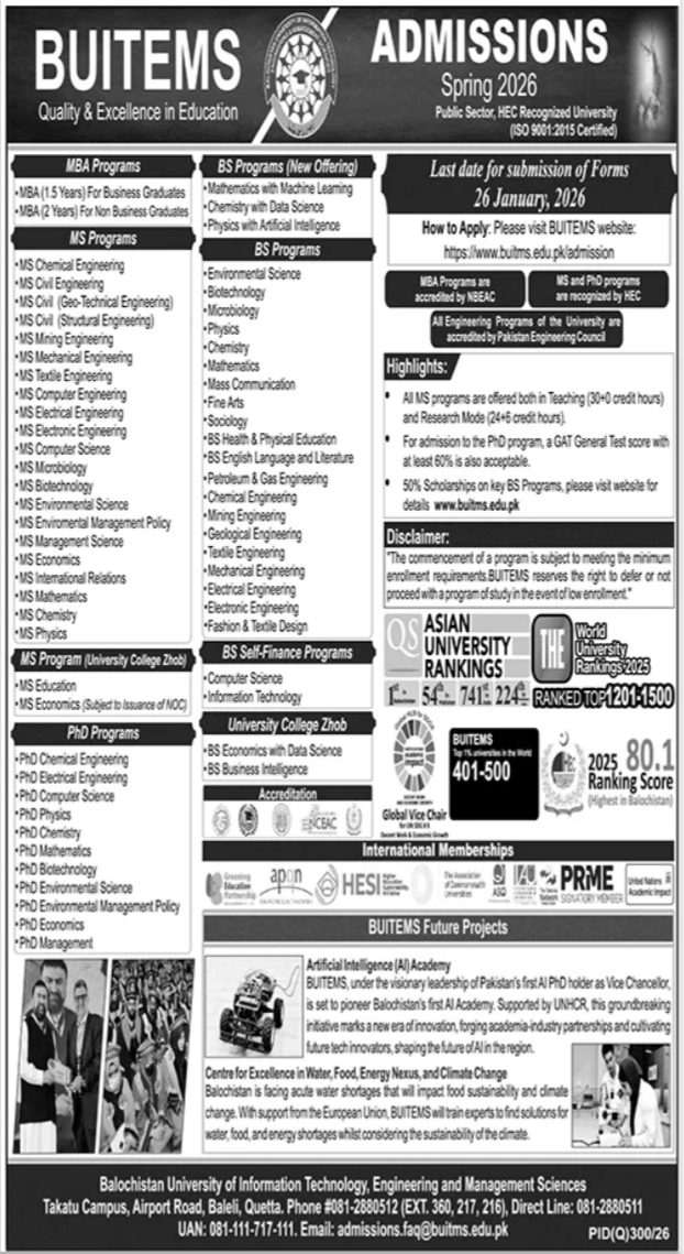 • Details available on the official website: www.buitms.edu.pk