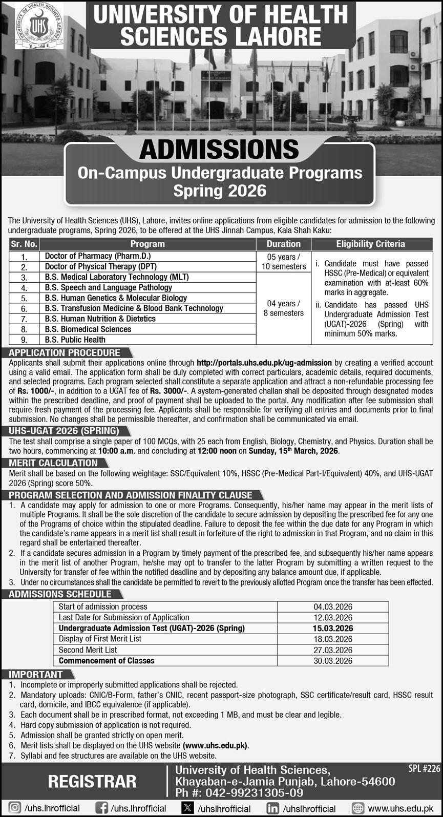 •Applicants must have passed the UHS Undergraduate Admission Test 2026 UGAT with minimum 50% marks.