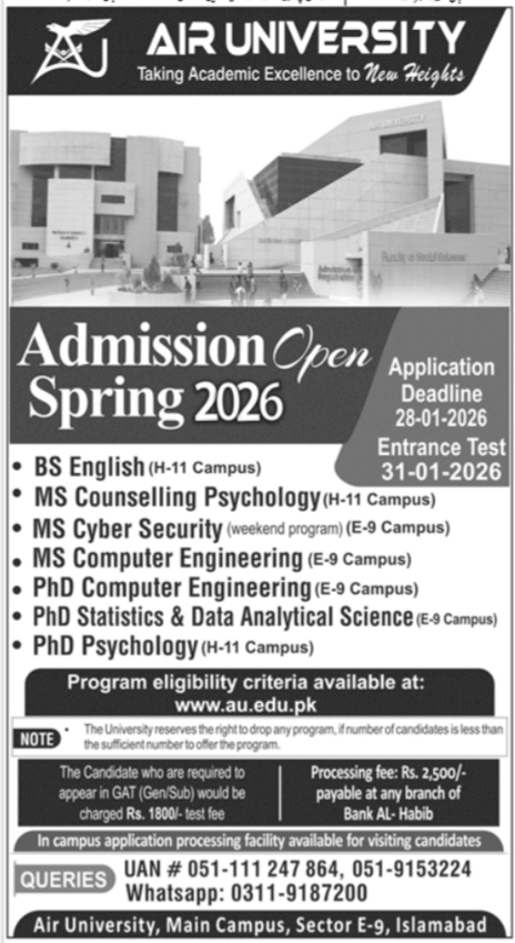 Air University invites applications for Spring 2026 admissions in selected Undergraduate, Graduate MS, and Doctoral PhD programs at its H-11 and E-9 campuses, Islamabad. Known for academic excellence, research-oriented programs, and strong industry relevance, Air University offers students a dynamic learning environment supported by experienced faculty and modern facilities.