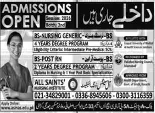 The All Saints Nursing Institute proudly announces that admissions 2026 are now open for the Session 2026 2nd Batch. Aspiring students are invited to apply for professional nursing degree programs designed to build successful careers in the healthcare sector.
