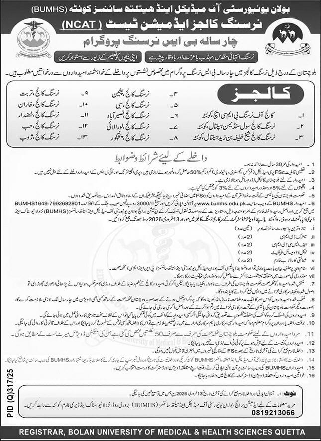 The healthcare sector in Balochistan receives a significant boost as the Bolan University of Medical & Health Sciences Quetta officially opens its doors for the 2026 academic session. The university has announced the Nursing College Admission Test NCAT for its prestigious four-year Generic BS Nursing program, aimed at empowering the youth with professional medical education.