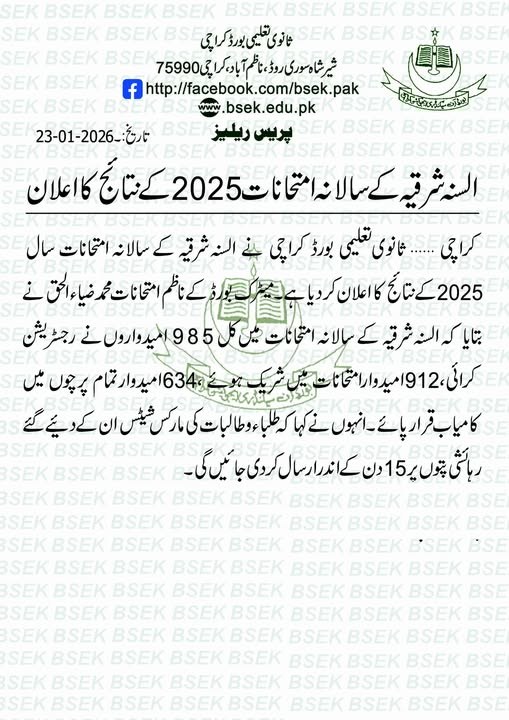Board of Secondary Education Karachi has conducted the annual exams for the Al-Sinnah Al-Sharqia for the year 2025 on the scheduled dates and time. The exams department of BSEK took time in checking of the answer sheets of the participating students and prepared their BSEK Karachi Al-Sinnah Al-Sharqia Annual Exams 2025 Result.