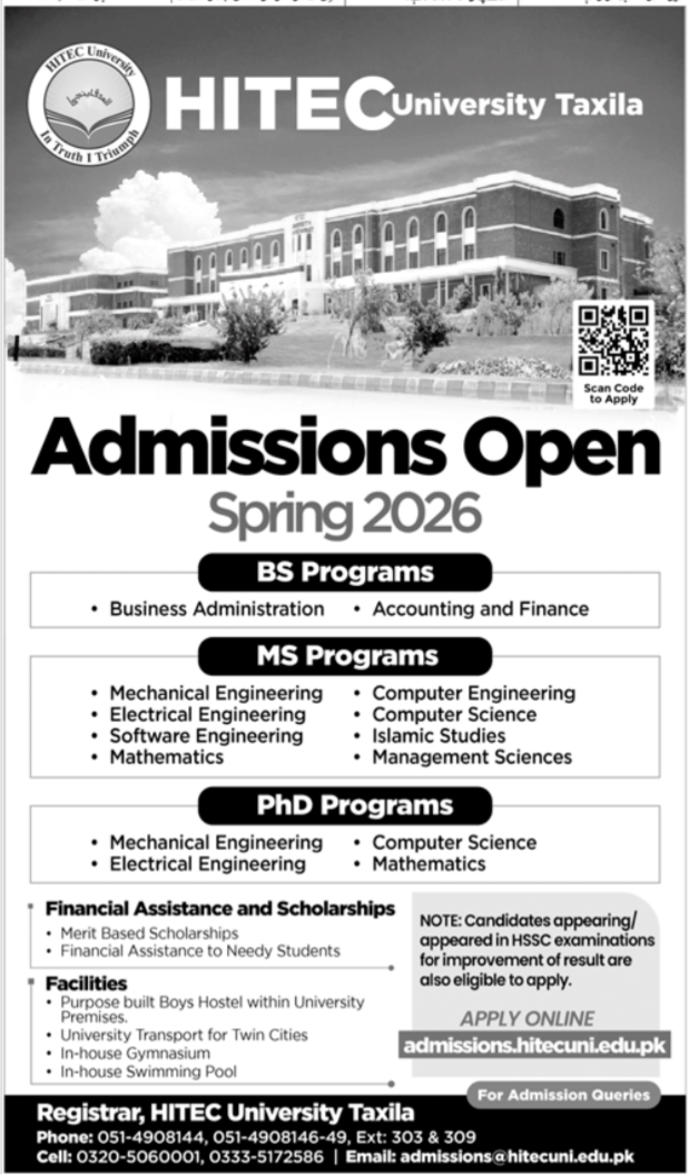 BS,MS,MPHIL,PHD Admissions 2026 open in Hitec University