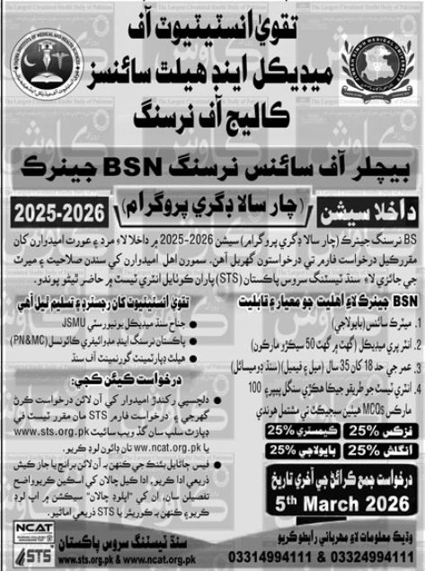 - Appearance in the entry test conducted by the Sindh Testing Service STS.