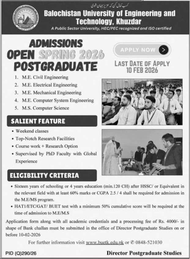 The Balochistan University of Engineering and Technology BUETK has officially opened its doors for the Spring 2026 semester, inviting applications for its prestigious postgraduate programs. As a premier public sector institution recognized by the Higher Education Commission HEC and the Pakistan Engineering Council PEC, BUETK continues to be a cornerstone of technical education in the region.