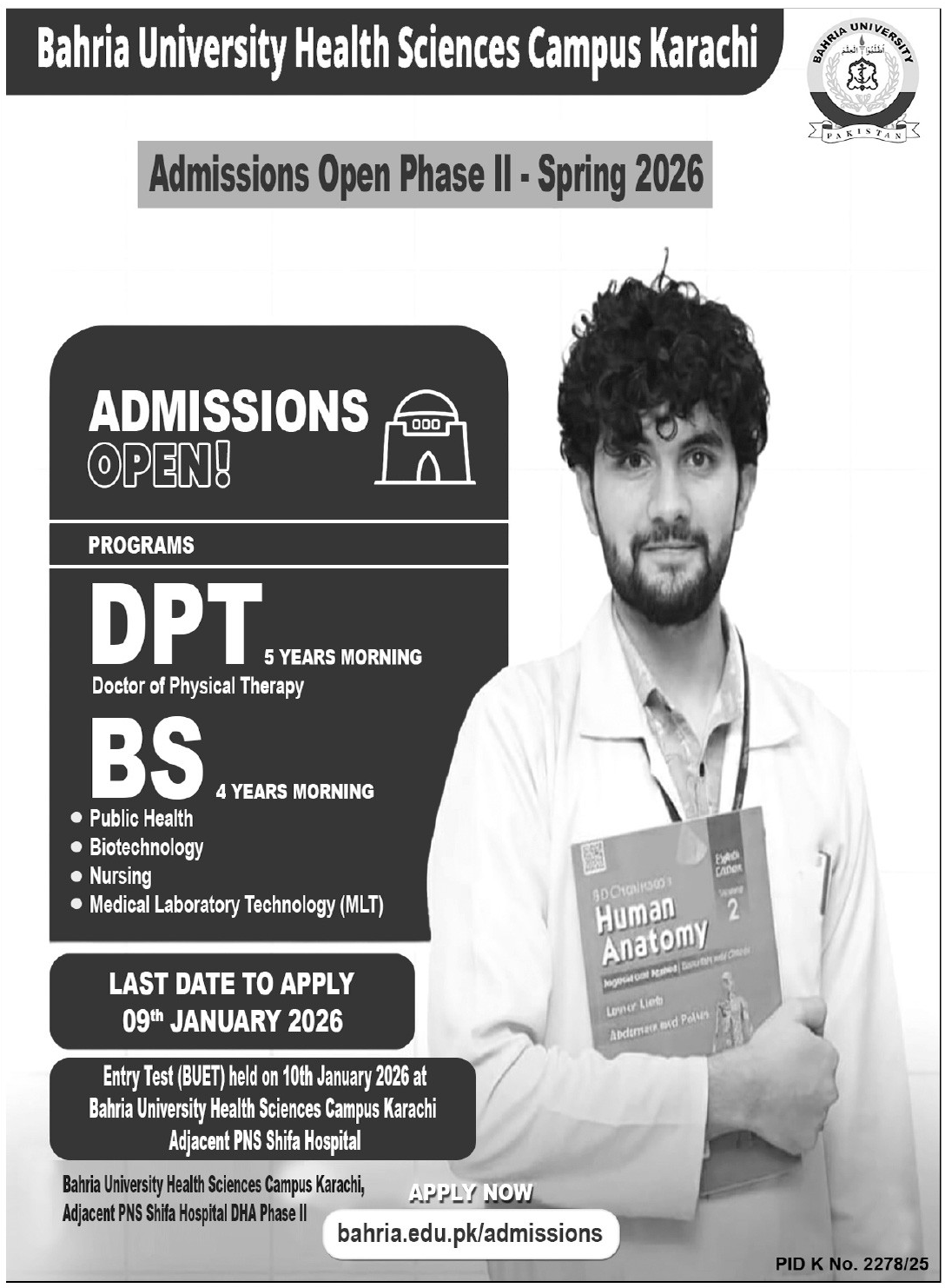 Bahria University Health Sciences Campus Karachi BUHSCK has officially announced Admissions Open Phase II for Spring 2026, inviting aspiring students to apply for a range of undergraduate and professional health sciences programs. Known for its academic excellence, modern facilities, and strong clinical exposure, Bahria University continues its commitment to developing competent healthcare professionals for the future.