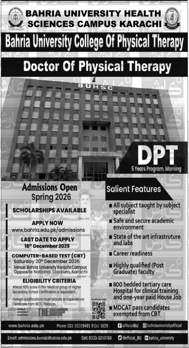 Bahria University Health Sciences Campus BUHSC, Karachi, in collaboration with the Bahria University College of Physical Therapy, is now accepting applications for the Doctor of Physical Therapy DPT program for Spring 2026. This is a 5-year, morning program designed to provide students with world-class education, hands-on clinical training, and career-ready skills in physical therapy.