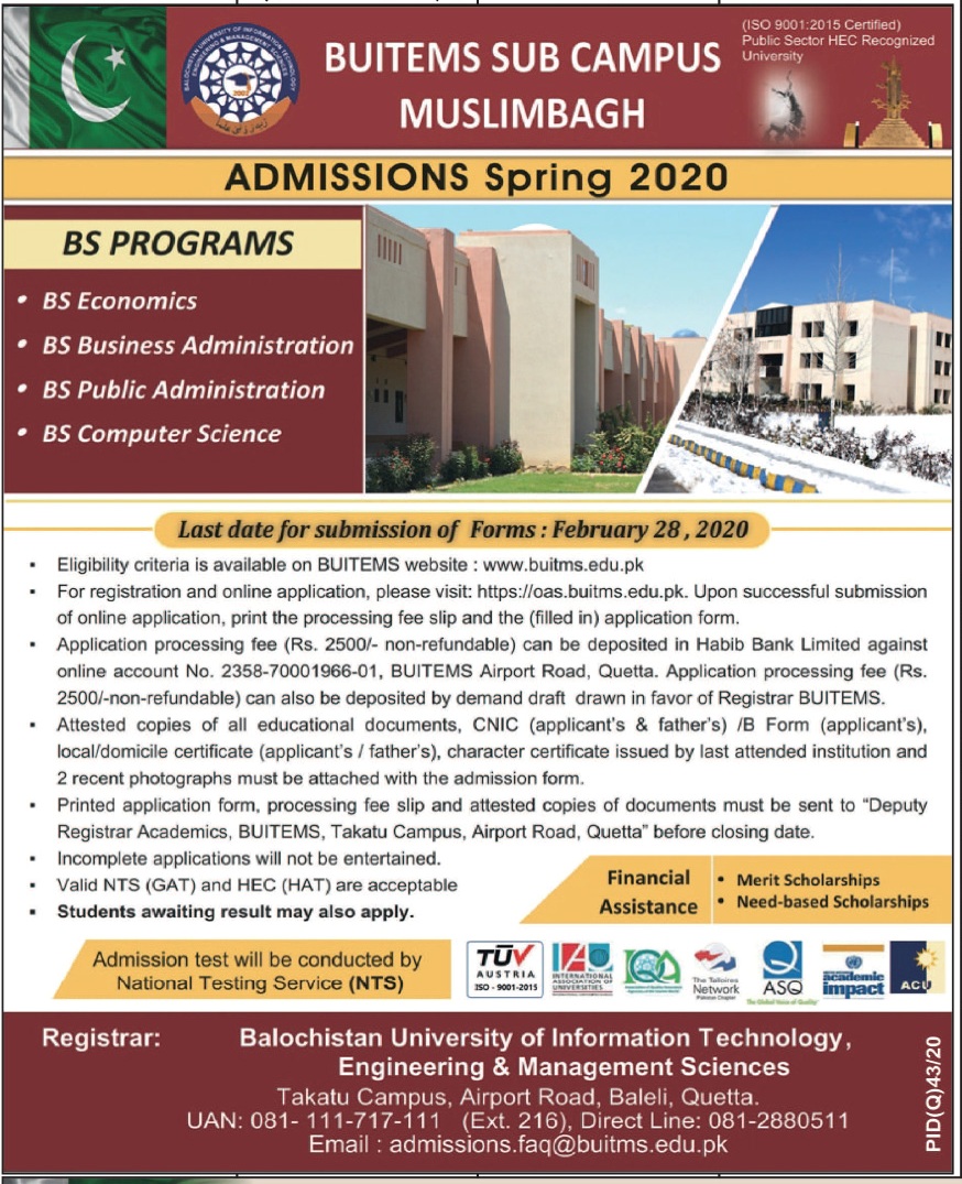 Engineering and Management Sciences announced the Admission for the session of 2020. The Balochistan University of Information Technology,
