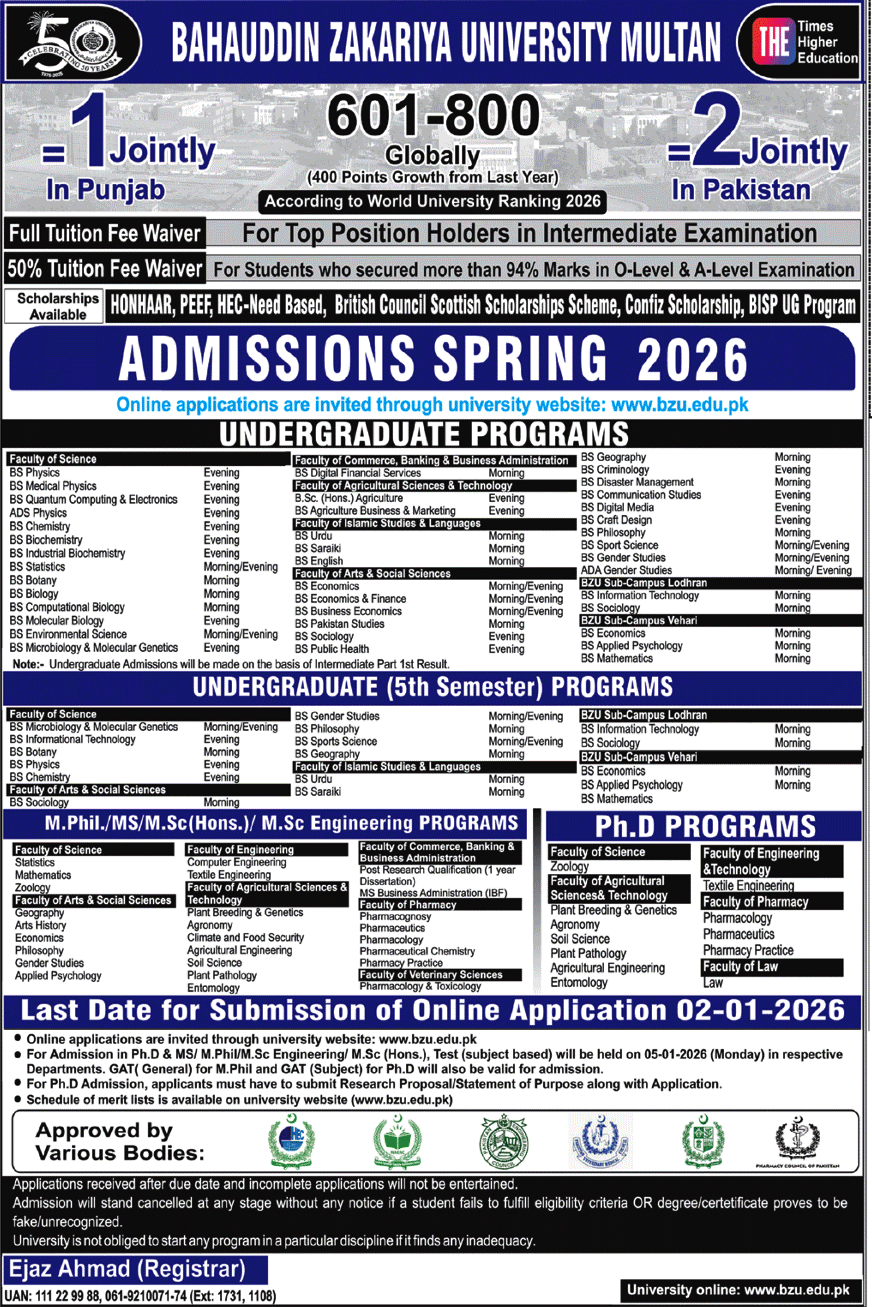 Bahauddin Zakariya University BZU, Multan, one of the leading public sector universities in Punjab, has announced Spring 2026 admissions for Undergraduate, 5th Semester, MS/M.Phil, M.Sc Hons., Engineering, and Ph.D programs. Online applications are invited through the official university website.