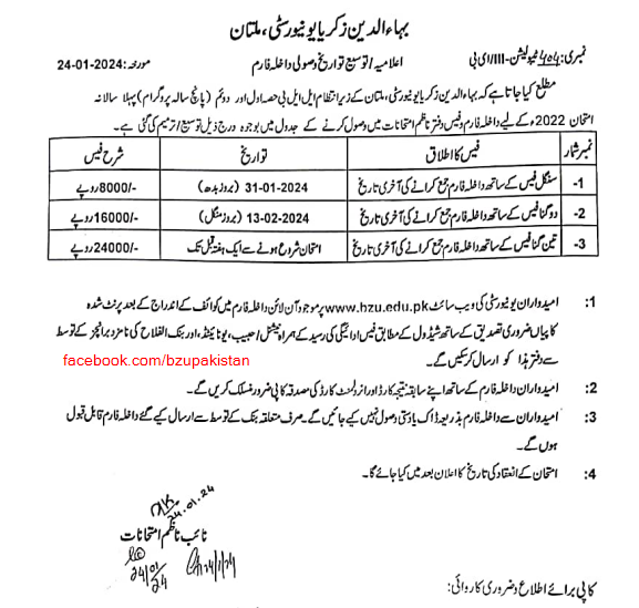 According to the detailed information of BZU LLB 1st Annual Exams 2022 Forms Schedule, the candidates can send their application forms with single fee payment of Rs.8000/- by the final date of 31-01-2024. The candidates can forward their application forms with double fee of Rs.16000/- by the closing date of 13-02-2024. The candidates can also forward their admission forms with the deposit of the triple fee of Rs.24000/- one week before the start of their exams.