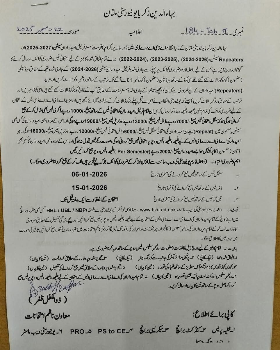 Bahauddin Zakariya University Multan is going to manage the Associate Degree Arts / Associate Degree Science first semester exams for the fresh students of 2025-27 and the repeaters of the sessions of 2022-2024, 2023-2025 and 2024-2026. All of the affiliated colleges are instructed to submit the admission forms and fee of their enrolled students to this university under this BZU Multan ADA/ADS 1st Semester Exams 2025-27 Forms Schedule.