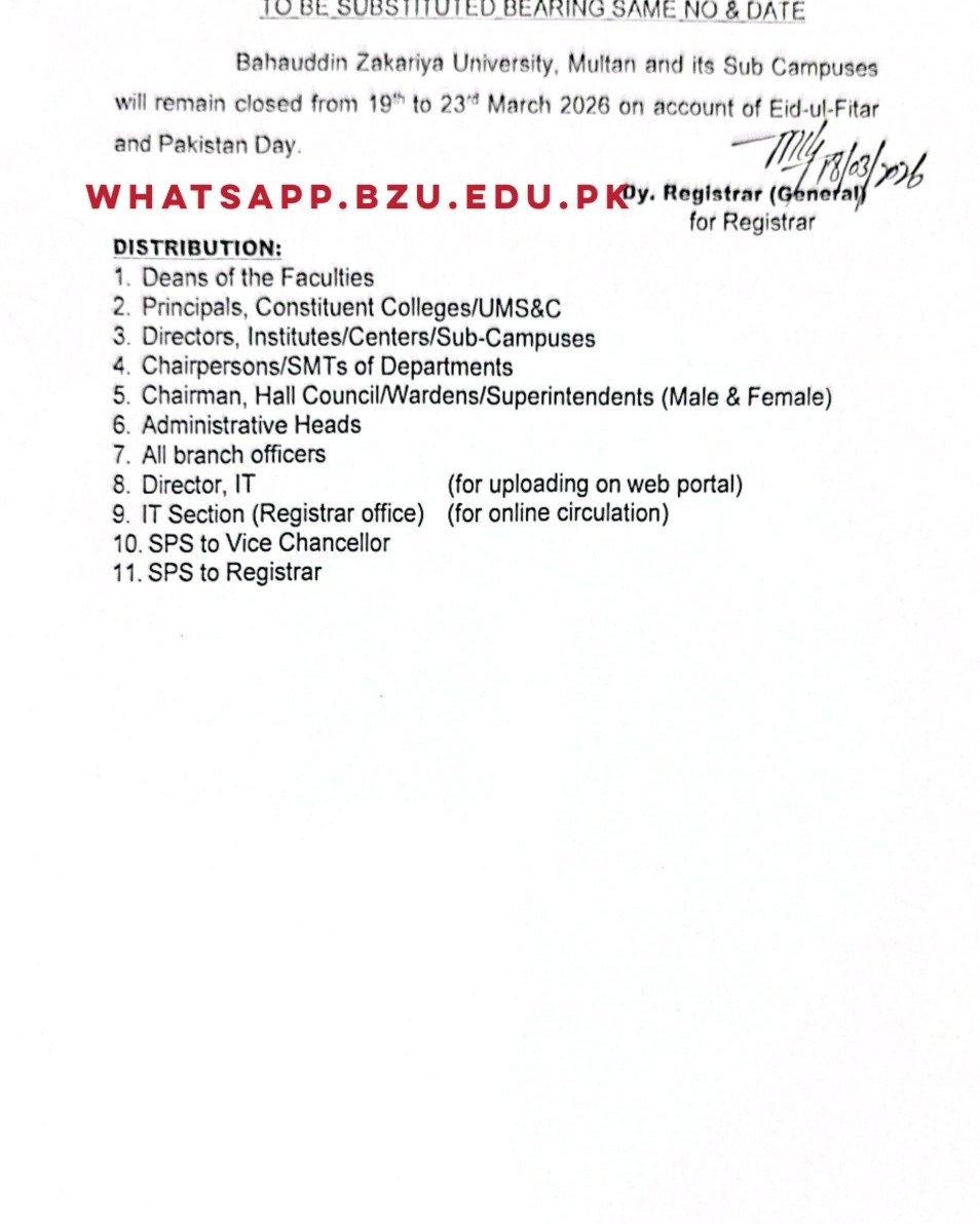 Bahauddin Zakariya University BZU, Multan, has officially announced a series of holidays for its main campus and all regional sub-campuses. According to the notification issued by the Registrar’s office, the university will remain closed from March 19th to March 23rd, 2026. This five-day break is scheduled to observe two significant occasions: the religious festival of Eid-ul-Fitr and the national holiday of Pakistan Day.
